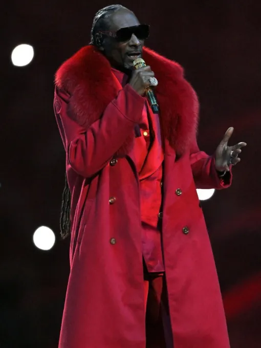 The coat featured an oversized white PU fur collar. It showcased a traditional button-style front closure. The coat included two large side pockets at the waist. Snoop wore full-length sleeves with open hem cuffs. The coat’s back panel extended mid-thigh in a half-tail. Designers lined the coat in soft black or red viscose.