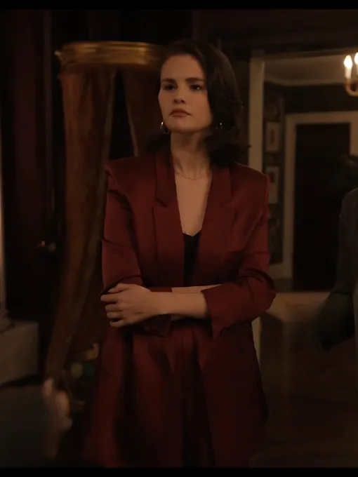 Selena Gomez shines as Mabel Mora in Episode 5x04. She wears a Lapointe satin blazer, radiating elegance and power. The blazer highlights her role in Only Murders in the Building. It cements her status as a modern style icon. Bold burgundy and tailored design showcase her confident fashion sense. Fashion, like detective work, rewards attention and confidence.
