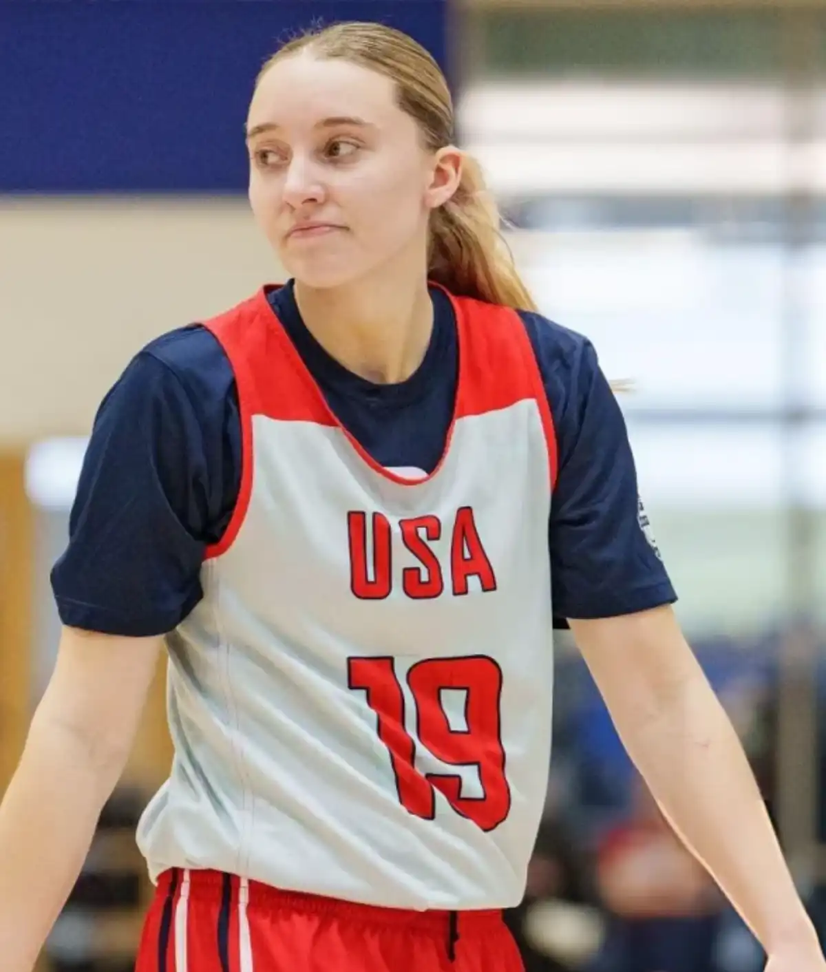 The Paige Bueckers jersey showcases a crisp white base with bold red and royal blue accents. These accents reflect Team USA’s patriotic spirit and energize the overall design. Across the chest, designers display “USA” in bold block lettering for strong visibility. Additionally, Paige Bueckers’ number 19 appears in vivid red with a contrasting outline. This outline ensures maximum visibility during fast-paced game action and fan recognition. The V-neck collar enhances style while providing comfortable movement on the court. Moreover, rib-knit armhole trim features red and blue stripes, balancing fashion and comfort.
