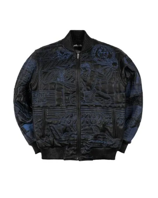 This jacket comes from Pelle Pelle’s bold, retro-leaning streetwear tradition, reflecting the brand’s long history of expressive, graphic-heavy outerwear in hip-hop and urban culture. The front is crafted from rich leather with colorful embroidered graphics, a structured zip-up closure, and strong paneling that gives it a confident, standout look. The back carries large, detailed artwork and bold lettering across the shoulders, ensuring the jacket makes just as strong an impression from behind.