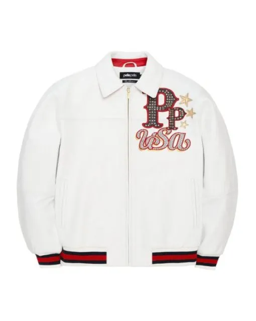 5. Pelle Pelle 2025 Stars And Stripes Rhinestone USA Logo and Home Of The Brave Patriotic Embroidery White Leather Bomber Jacket