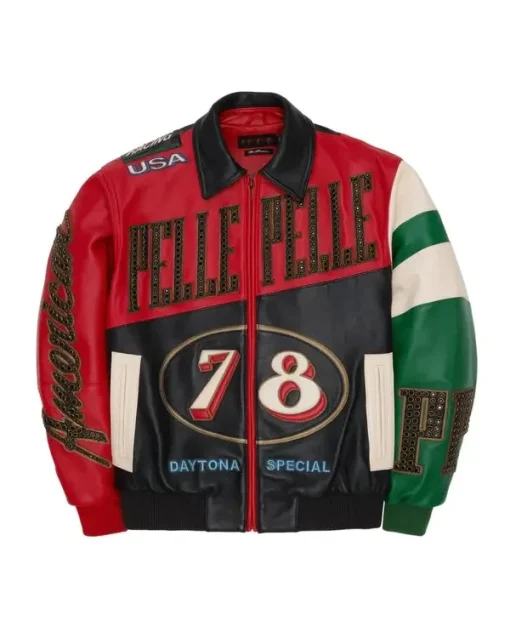 6. Pelle Pelle Daytona Special Rhinestone Embellishments and Color-Block Panels Multicolor Racing Bomber Jacket
