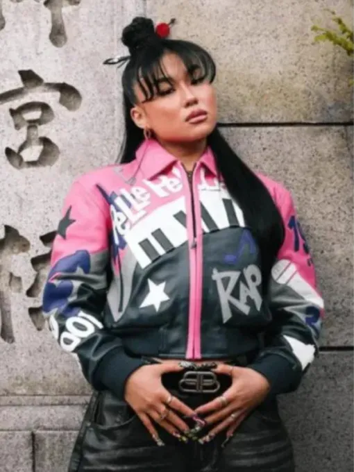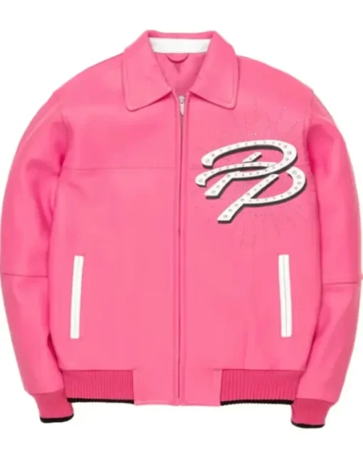 This jacket represents Pelle Pelle’s confidence-driven design philosophy, aimed at those who embrace bold colors and standout fashion. The front features a vibrant pink leather base with large lettering and graphic elements, paired with a strong, structured closure. The back continues the same bold pink tone with oversized “Greatest of All Time” style graphics that dominate the design.