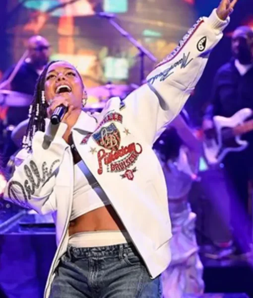 Alicia Keys wore this bomber jacket during her appearance on The Tonight Show, where her refined yet powerful style was on full display. The front features a sleek bomber silhouette with a smooth, polished finish, clean lines, and a structured fit suitable for a high-profile TV appearance. The back keeps the design minimal and streamlined, ensuring the jacket looks elegant and camera-ready from every angle.