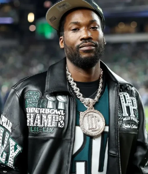 Meek Mill, known for his strong connection to Philadelphia, has been seen wearing this Eagles-themed leather jacket as a symbol of hometown pride. The front features premium leather in team colors with bold Eagles logos and a strong, confident structure. The back highlights large team graphics and branding, making the jacket a powerful blend of music culture, sports loyalty, and streetwear style.