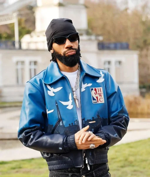 The navy blue leather jacket is a premium streetwear statement piece inspired by Phyno’s appearance at the 3.Paradis Men’s Fall/Winter show in Paris. Crafted from high-quality smooth leather with a refined sheen, it features a striking two-tone blue gradient design that transitions from cerulean shoulders to a deep navy base. The jacket is highlighted with a detailed Paris city skyline graphic across the midsection and artistic white dove motifs symbolizing peace and movement. A bold NBA “HWC” (Hardwood Classics) patch on the chest adds a retro sports heritage touch, while its bomber silhouette is completed with a wide leather collar, full-zip closure, and ribbed cuffs for a structured fit.