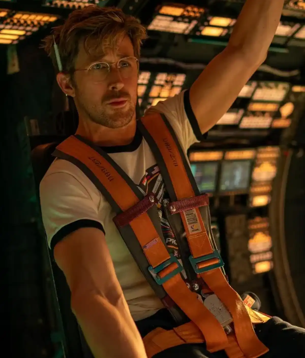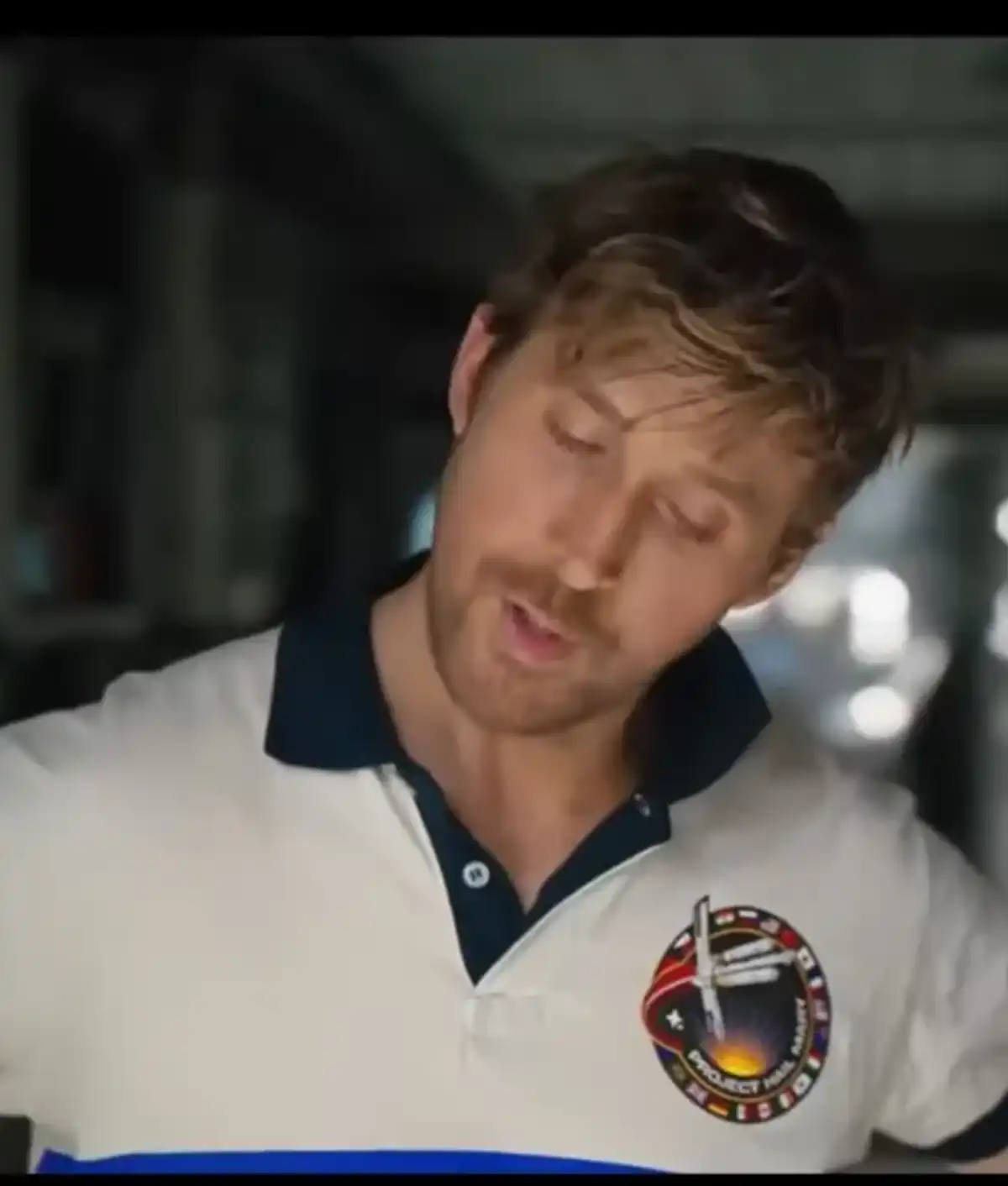 Ryan Gosling’s Ryland Grace wears a white polo-style t-shirt that blends athletic aesthetics with mission-themed branding. The shirt features a high-contrast navy collar and sleeve trim for a sharp, striking look. A large circular Project Hail Mary patch decorates the chest, showing a spacecraft and international flags. The tri-tone palette of white, navy, and royal blue enhances the shirt’s visual appeal. A two-button placket completes the design, offering a modern tailored fit for casual wear or cinematic authenticity.
