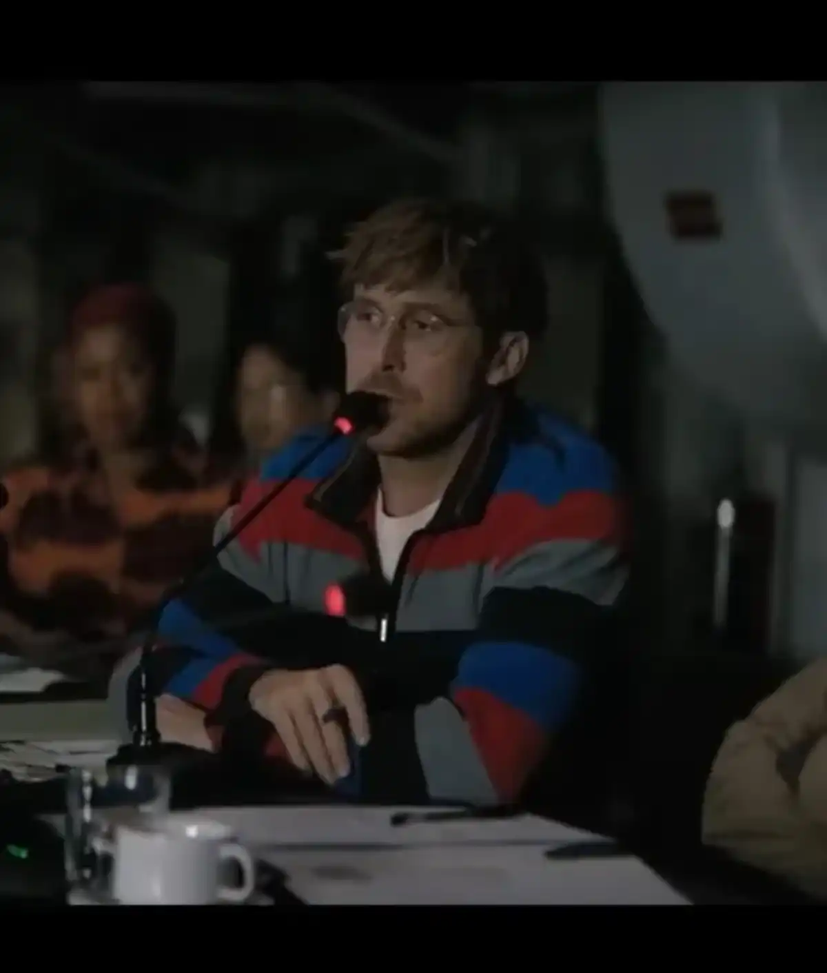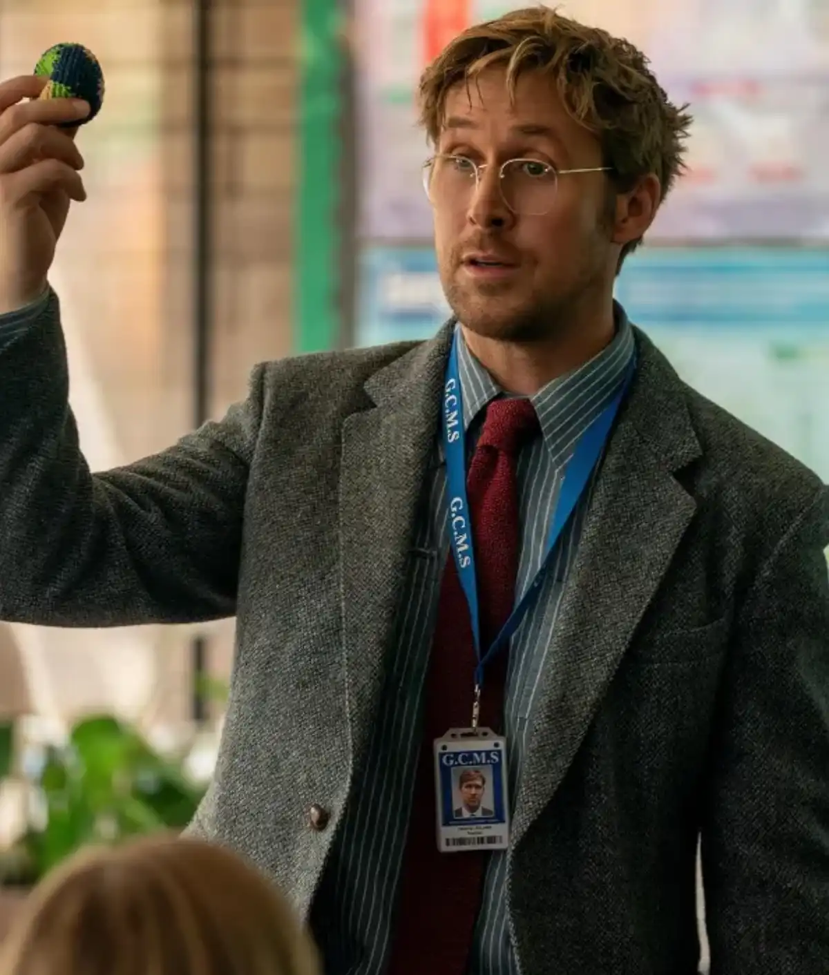 At promotional events, Gosling pairs a medium-grey tweed blazer with a vertical-striped shirt and textured burgundy tie. The blazer’s structured shoulders and single dark button create a refined “professor meets professional” look. He adds a blue GCMS lanyard and ID badge, highlighting the practical, uniform-inspired design. This outfit combines classic tailoring with subtle sci-fi sophistication.