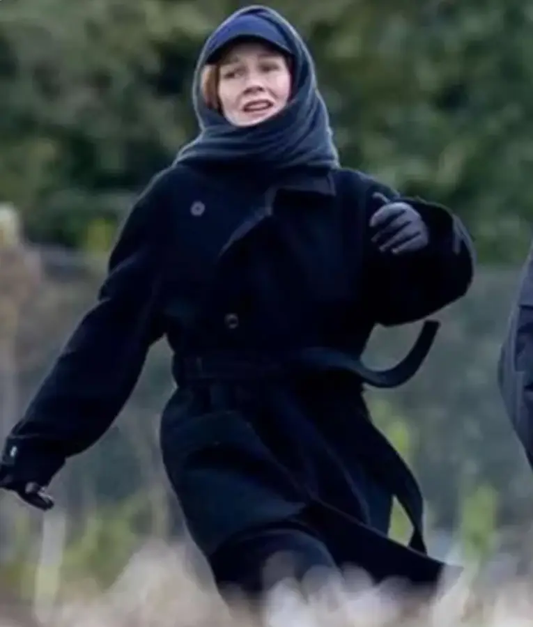 Hüller wears a deep black, mid-length structured coat as Eva Stratt, cinched with a fabric belt at the waist. Double-breasted buttons, wide notched lapels, and adjustable sleeve cuffs create the authoritative, utilitarian presence her character requires. The heavyweight wool blend provides both warmth and durability for her role leading the international task force.
