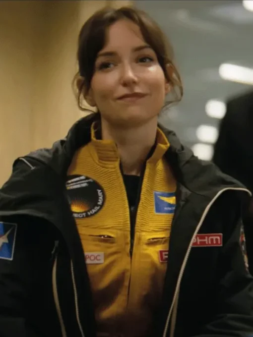 Liz Kingsman wears a utilitarian black jacket with a modern aerospace-inspired design. It features a relaxed, oversized silhouette and high collar. White piping runs along the zipper flap, while PHM mission patches add practicality and maintain a technical, professional appearance. Heavy-duty synthetic fabric protects against cold, making the jacket perfect for the film’s high-stakes, challenging environments.