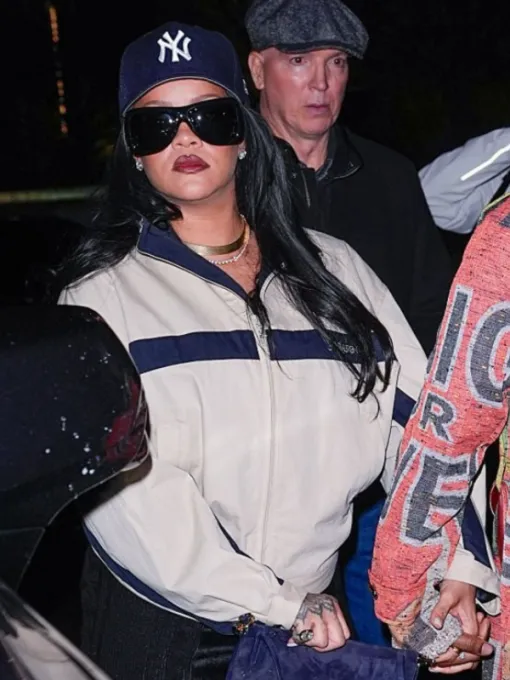 Rihanna wore a $3,200 cream windbreaker by Yves Saint Laurent. The jacket featured lightweight construction with a bold, sporty attitude. Its soft cream tone delivered a clean, elevated appearance. A navy blue horizontal stripe crossed the chest and upper back. The stripe added sharp contrast against the neutral base. Deep navy accents lined the inner high-neck collar.