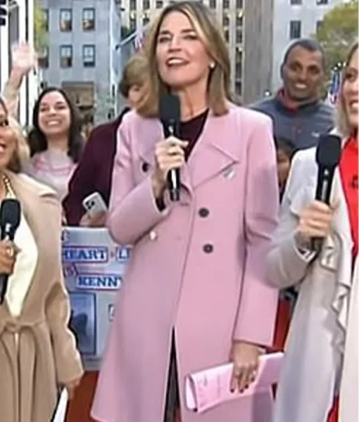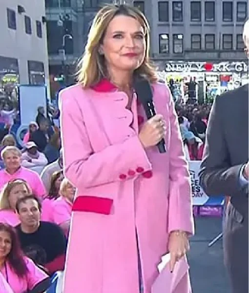 Bring a touch of whimsical elegance to your wardrobe with the coat spotted on Savannah Guthrie during NBC’s Today show on November 7, 2025. The Sunday Best Coat perfectly blends playful charm with refined sophistication. Crafted in a soft pink or rose-colored fabric, this mid-length, single-breasted coat showcases Savannah’s signature feminine style. Eye-catching color-blocking and contrasting details in vibrant hot pink/fuchsia give the coat a striking, fashion-forward appeal. The Peter Pan collar in contrasting hot pink velvet adds a sweet, polished touch, while the scalloped front placket with large round hot pink buttons makes a statement of delicate elegance. Further elevating the design, the coat features hot pink velvet-trimmed flap pockets and sleeves with visible cuffs in a playful pink and red checkerboard pattern. The contrast adds both personality and a hint of retro flair. This coat is a perfect combination of sophistication, fun, and standout style, ideal for daytime appearances or making a chic statement in cooler weather.