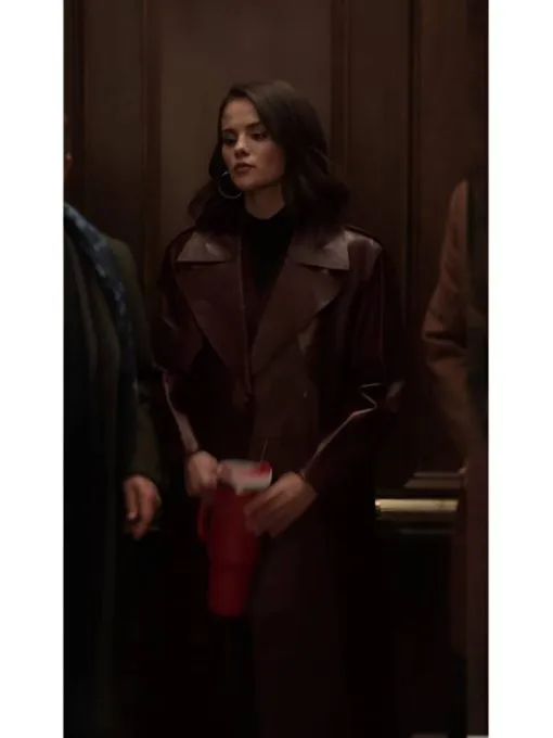 7. Selena Gomez Maroon Leather Trench Coat — Season 5, Episode 1 “Nail in the Coffin”