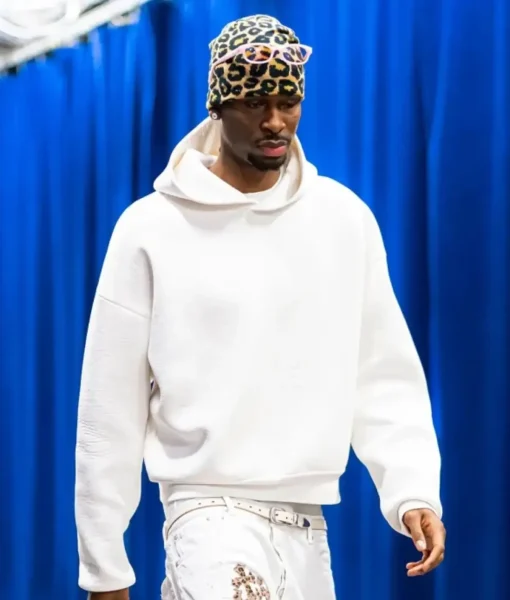 A wide double-layered hood defines the upper silhouette. Next, designers eliminate visible drawstrings to create a seamless neckline. This uninterrupted design also strengthens its runway-inspired appeal. Consequently, the White Hoodie reflects modern NBA tunnel fashion. It mimics his iconic long-coat looks.