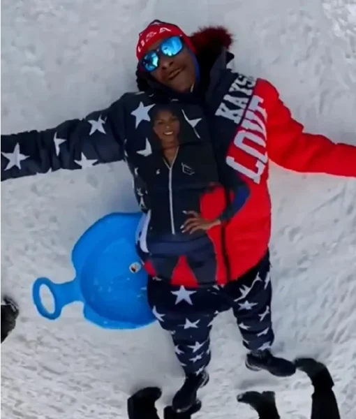 A striking split-color jacket with maroon and cherry red, patriotic stars, and a photorealistic portrait on the chest. The quilted puffer offered maximum warmth, and coordinated pants and accessories reinforced Team USA pride.