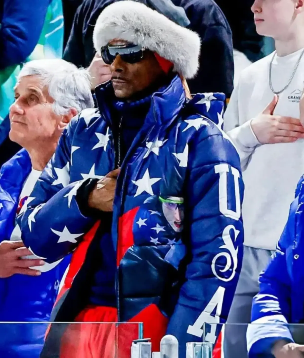 Snoop’s Ralph Lauren closing ceremony jacket featured tri-color block design with “2026” and “TEAM USA” graphics. The puffer combined warmth, patriotic symbolism, and bold winter styling, perfect for ceremonial appearances.