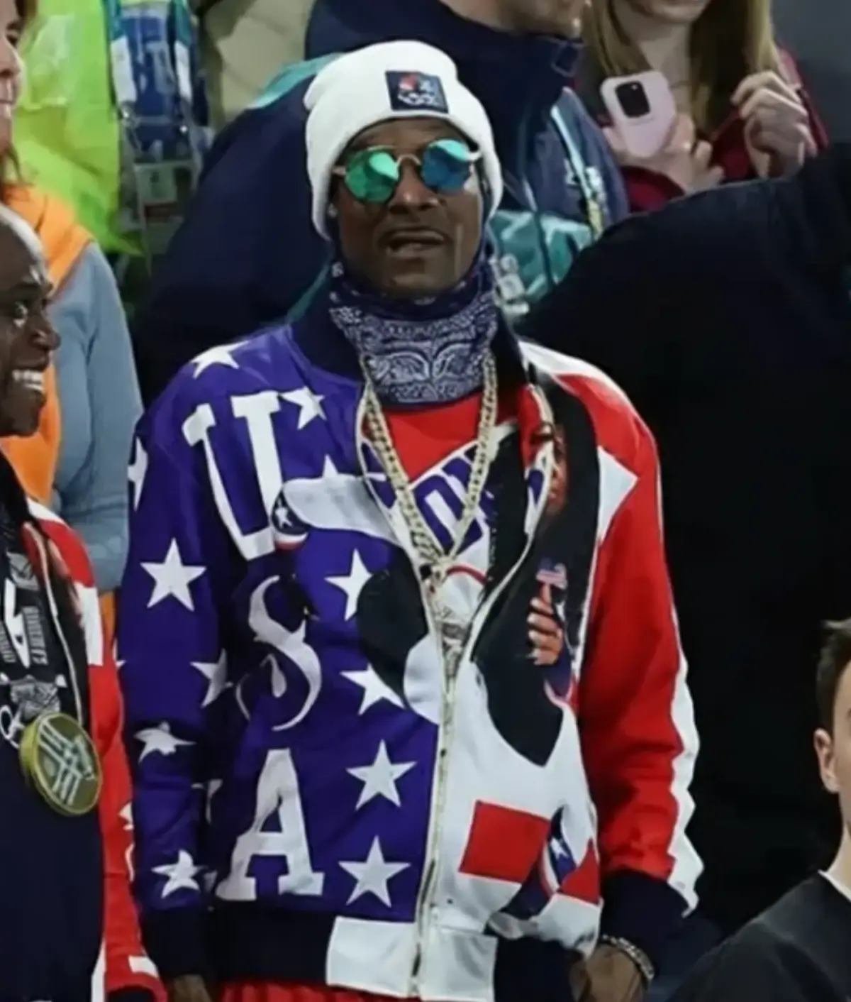 The coat celebrated both Olympic pride and Snoop Dogg’s West Coast flair.