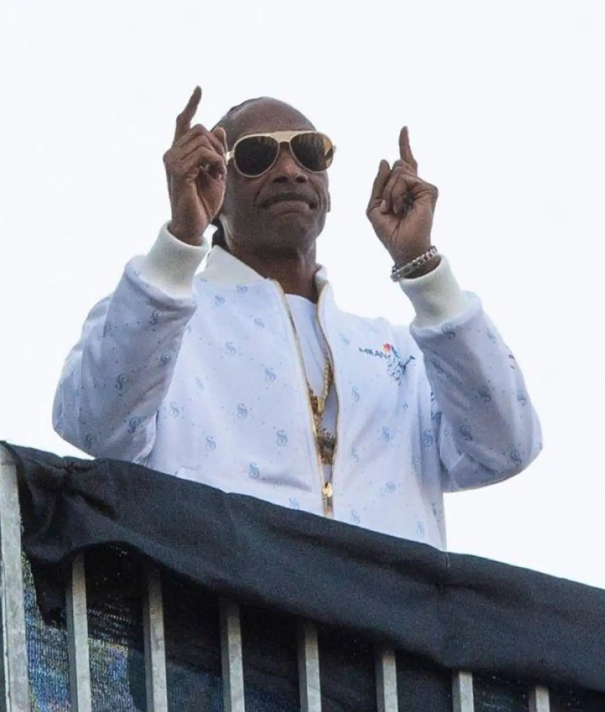 Snoop wore a crisp white bomber zip-up with light blue cursive “S” logos. The jacket featured the Olympic rings, ribbed cream details, and a gold-tone zipper. It blended streetwear luxury with Olympic prestige in a standout design.