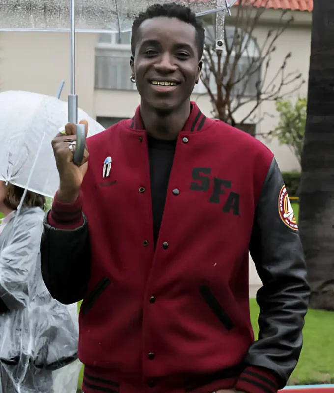 This varsity bomber combines traditional sportswear with sci-fi branding seamlessly. Moreover, its maroon body contrasts sharply with black leather sleeves. Additionally, rib-knit collar, cuffs, and hem provide structure and enhance comfort. The chest displays bold “SFA” lettering prominently. Furthermore, sleeve patches and emblem detailing add authentic character and visual depth. Finally, its relaxed fit ensures easy everyday wear..