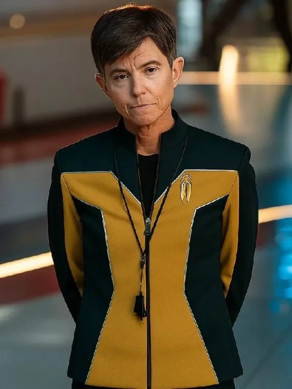 Tig Notaro returns as Commander Jett Reno, serving as instructor aboard USS Athena. Her jacket reflects a sharp, practical, unconventional teaching style. Moreover, the design features a deep forest green base across shoulders, sleeves, side panels. It contrasts with a bold mustard yellow central panel. Additionally, a sharp angular V Y shape across the chest creates structured architectural silhouette. Silver piping highlights geometric paneling and delivers a high-tech finish. Meanwhile, a mandarin-style collar reinforces a formal uniform look. In addition, a full front zipper maintains functionality and clean lines. Furthermore, a gold insignia sits on the chest. Meanwhile, a black lanyard with a small device adds sci-fi utility elements.