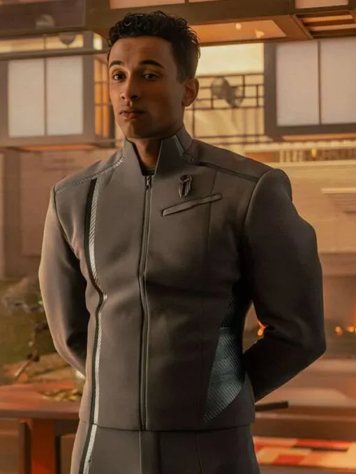 Caleb Mir’s jacket introduces a tactical, survival-inspired aesthetic with charcoal grey base. Additionally, silver paneling and textured side sections reinforce its rugged design. Furthermore, symmetrical structure and central zipper create a disciplined, functional appearance. Moreover, a split mandarin collar forms a sharp V-cut neckline. Additionally, utility-style chest pocket detailing and reinforced seams enhance durability. Finally, a dark Starfleet insignia sits above the pocket area.