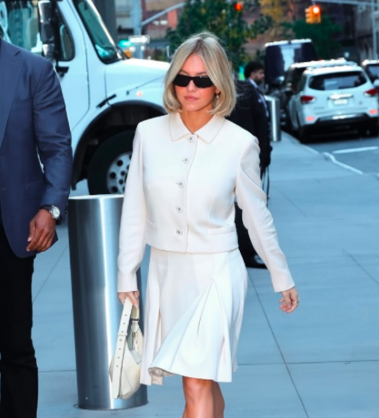 Sydney Sweeney masters monochrome in her off-white co-ord set. The ensemble includes a cropped jacket and matching pleated mini skirt. It looks polished while maintaining a youthful and effortless charm. Structured shoulders and crisp tailoring give the jacket sophisticated appeal. The high-waisted mini skirt keeps the outfit fun and flirty. Soft cream tones provide timeless elegance for the city or evening. She pairs it with minimal accessories for a refined look. This outfit proves that sometimes simplicity truly achieves maximum style impact.