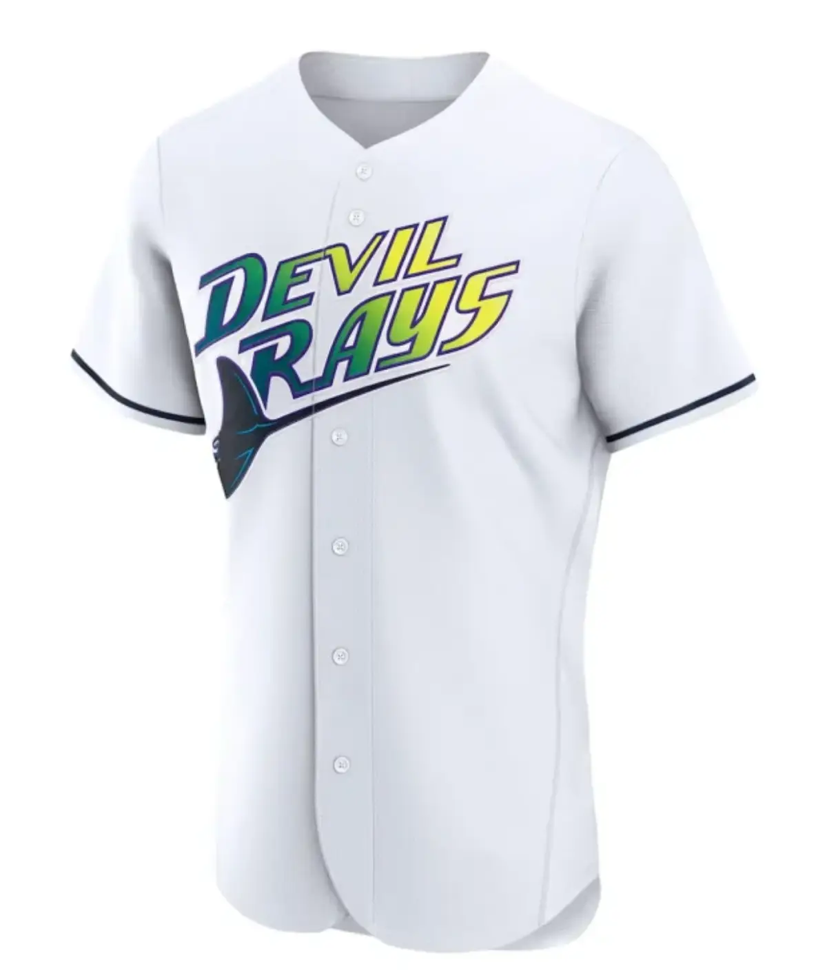 The white jersey highlights the striking “DEVIL RAYS” wordmark at the chest. Additionally, italicized lettering transitions from deep teal and purple to bright lime and yellow. This gradient creates a dynamic, eye-catching effect across the front of the jersey. Beneath the wordmark, a stylized manta ray graphic flows across the chest. Its tail curves upward to underline “RAYS,” honoring the original franchise mascot. Consequently, the design adds a vivid sense of motion and energy.