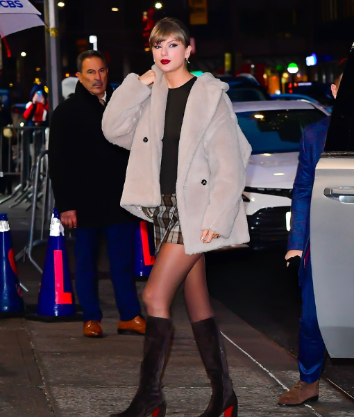 Taylor Swift Stuns in a Plush Faux Fur Coat Outside The Late Show with Stephen Colbert