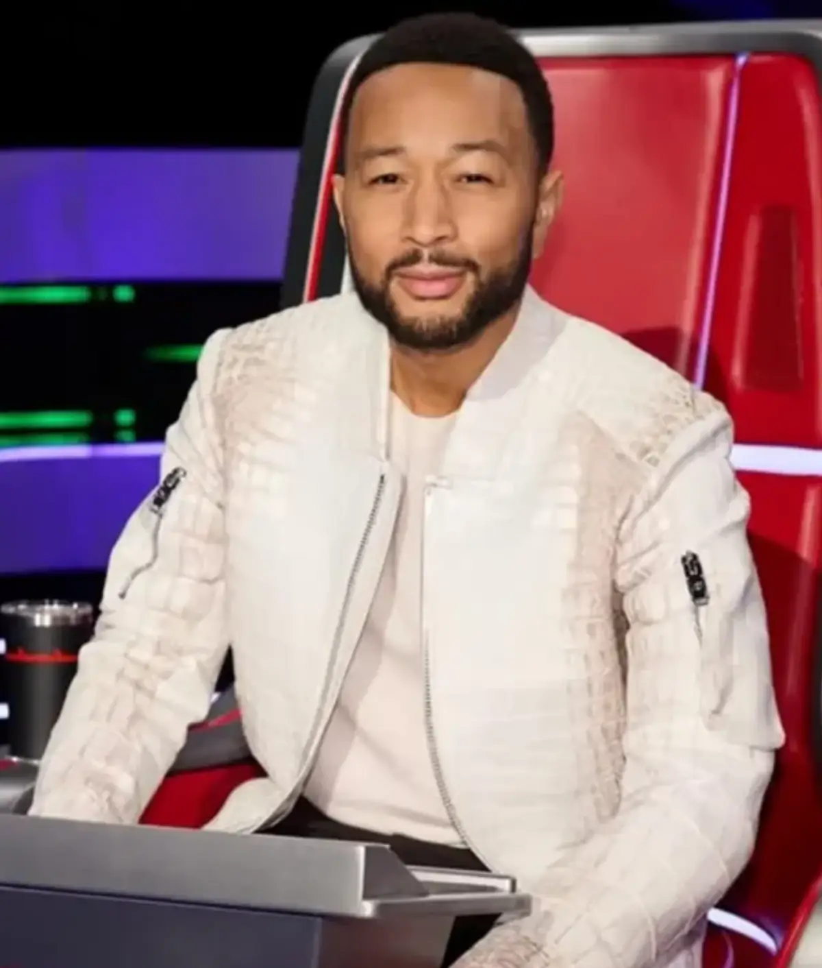Shop The Voice 2026 John Legend white crocodile leather jacket with chrome zipper, utility pockets, and a bold, modern luxury design inspired by his iconic style.