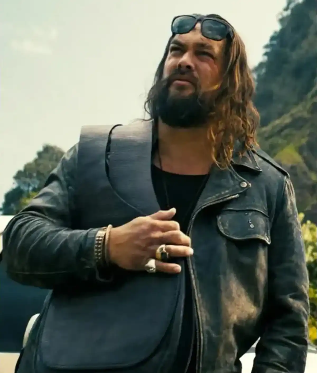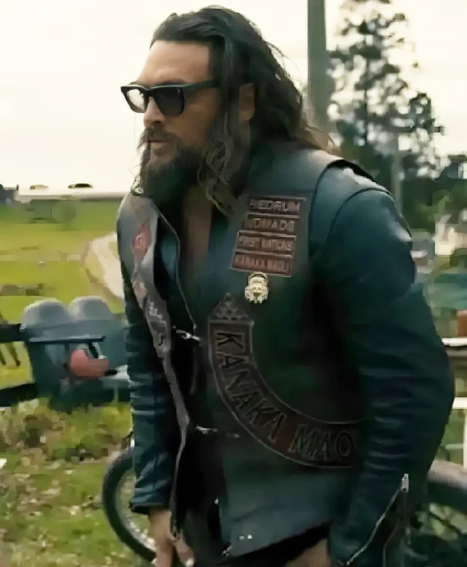 Used in raw, physical sequences, the leather vest emphasizes immediacy and aggression. Momoa wears it during hand-to-hand combat and high-intensity engagements.