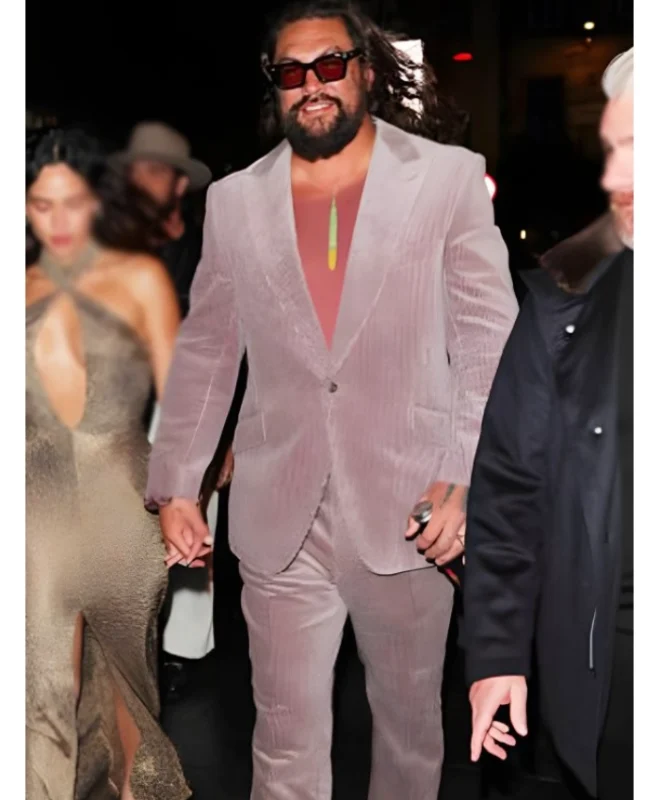 The velvet blazer appears during high-visibility, public-facing events. Momoa wears it in press or ceremonial sequences, emphasizing poise and deliberate presence.
