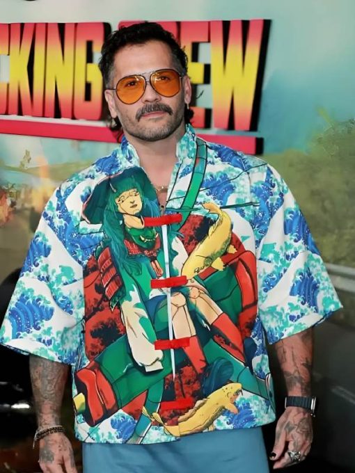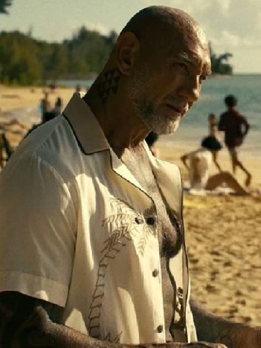 The palm tree shirt introduces lighter tones during downtime or casual moments. Bautista wears it in off-duty or humorous interactions, softening his otherwise intense presence.