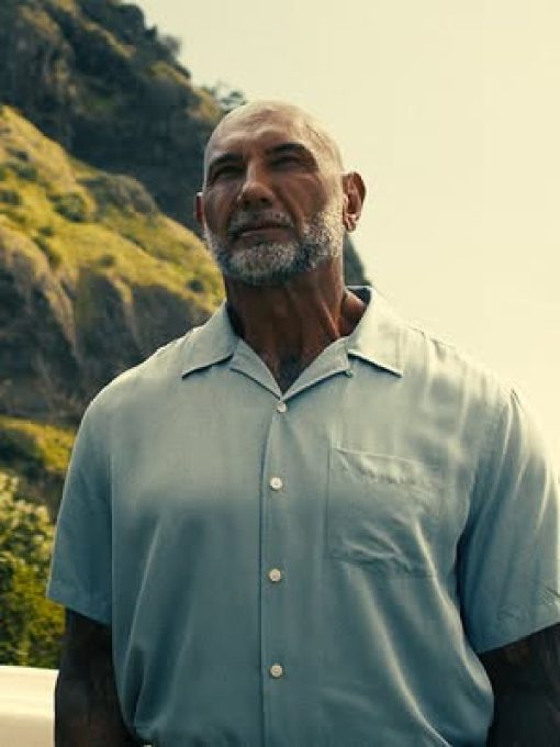 This calm blue shirt appears in strategic planning scenes, signaling composure and analytical thinking. Bautista’s character wears it during moments where intellect replaces brute force.