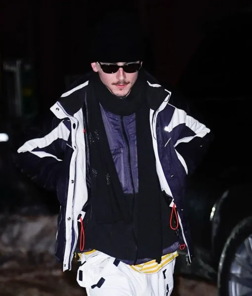 Timothée styled the jacket with a black beanie and a dark scarf. He emphasized comfort while maintaining his signature laid-back aesthetic. The outfit balances functional outerwear with contemporary street fashion. The Timothée Chalamet New York City navy jacket shows winter style without sacrificing personality, just like his playoff game tracksuit. Its bold contrast design and practical construction stand out immediately. The jacket captures the essence of modern city fashion and is now available on The Celeb Jackets. It also provides reliable warmth during cold urban days.
