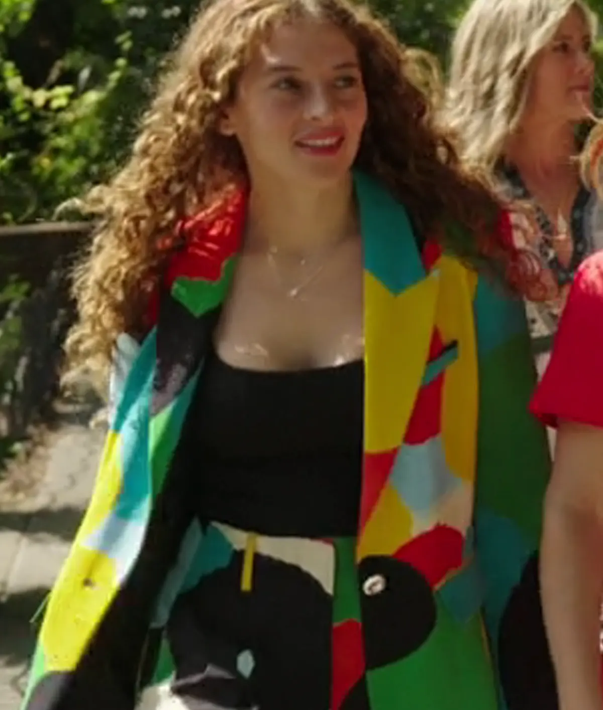 The blazer gains attention for its bold design. Furthermore, it blends art and fashion seamlessly. Its oversized silhouette aligns with current runway trends. Additionally, the vibrant color palette attracts fashion enthusiasts. Editorial styling further boosts its popularity and visibility. As a result, it reflects individuality and creative expression. Designers and stylists favor statement pieces like this blazer. Therefore, it continues to trend across fashion platforms. Stylists often pair the blazer with matching wide-leg trousers. This coordination creates a cohesive and bold fashion statement. Additionally, the outfit embraces modern matching set trends. They usually layer it over a simple white bandeau. Alternatively, they use a fitted bodysuit for a clean base.
