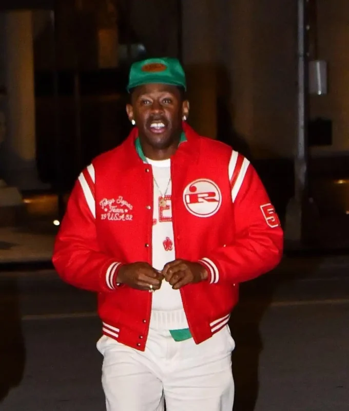 Vintage-style embroidery reads “Tokyo Japan Team 19 USA 52.” The text leans into retro athletic storytelling. Tyler pulls off that nostalgic sports narrative effortlessly. White sleeve stripes add sharp visual contrast. A shirt-style collar gives the jacket a clean structure. Striped ribbed trims keep the look structured yet relaxed. Dropped shoulders create a laid-back silhouette. The easy fit makes layering simple and natural. You can style it for creative shoots, concerts, or everyday statement wear. It’s varsity style, reworked with pure Tyler-core energy.