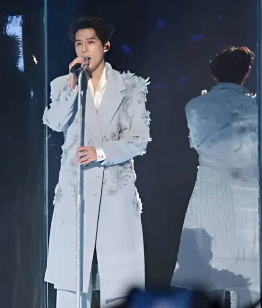 Intricate design elements truly elevated the overall look of the coat. The designer wove delicate feather-like embellishments into the coat’s surface. The garment displayed textured appliqué detailing across the shoulders and sleeves. Moreover, these soft layered accents added dimension and fluid movement. As a result, the outfit appeared dynamic under bright performance lighting. The feathered detailing provided a couture-inspired and polished finish. Additionally, the design blended modern tailoring with bold artistic flair. As Wang Anyu moved and sang into the microphone, the textures caught the light. Consequently, the pieces created a subtle shimmer effect across the stage. This shimmer enhanced the overall stage visuals. Therefore, this careful balance between minimalism and embellishment made the outfit impactful. However, the design avoided an overly ornate appearance. Instead, every detail conveyed clear intention and thoughtful craftsmanship.