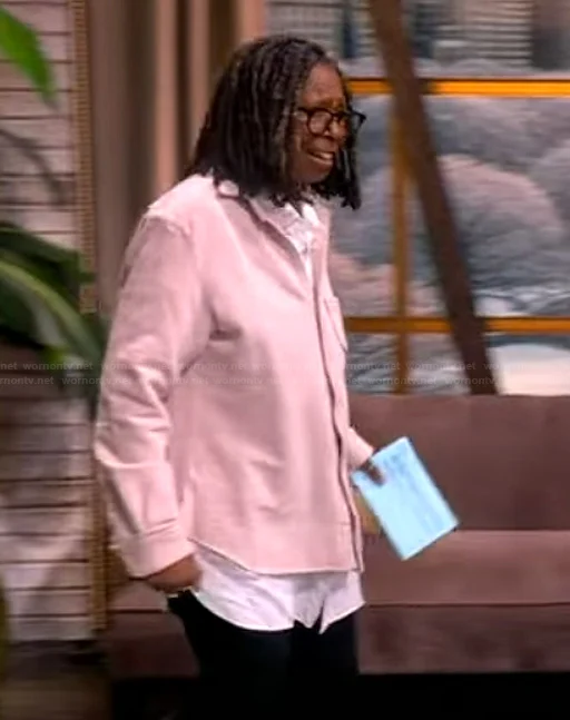 Also featured on The View, this outfit blends wearable comfort with visual interest, emphasizing Whoopi’s bold fashion choices. Design highlights include patterned fabric, subtle stitching details, a slightly relaxed fit, and tailored sleeve structure. The outfit achieves a balance of statement style and ease for on-air movement.