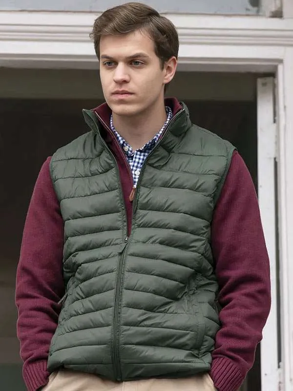 Jacob Buster plays Sean Bixby, balancing charm with secrecy. His olive green puffer vest delivers functional layering perfectly. Narrow horizontal baffles quilt the vest for even insulation. A high stand-up collar provides added wind protection. The vest features a full-length zipper with fabric pull tab. He styles the vest over a maroon quarter-zip sweater. He pairs it with a blue-and-white gingham shirt underneath. The outfit blends preppy aesthetics with outdoorsy practicality. Lightweight, water-resistant fabric ensures comfort and easy layering. The regular fit gives warmth and a polished, approachable look.