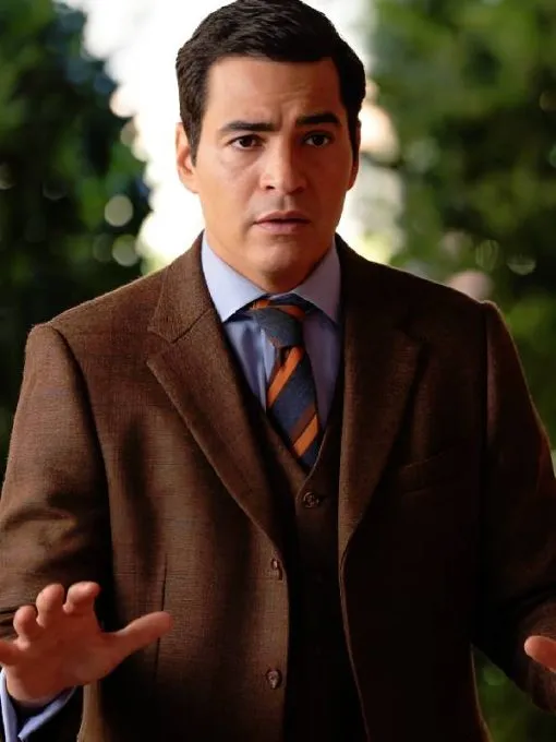 Ramón Rodríguez wears a brown plaid suit with classic tailoring. The suit includes a blazer, five-button waistcoat, and dress shirt. He pairs the ensemble with a sky-blue dress shirt. He adds a multi-tonal striped tie for visual interest. The blazer displays structured shoulders, notched lapels, and textured fabric. The fabric resembles tweed, giving depth and tactile appeal. Tonal buttons accent the outfit’s warmth and traditional formality. Complementary accents unify all elements of his coordinated look. This outfit reflects his character’s personal and cultural history.