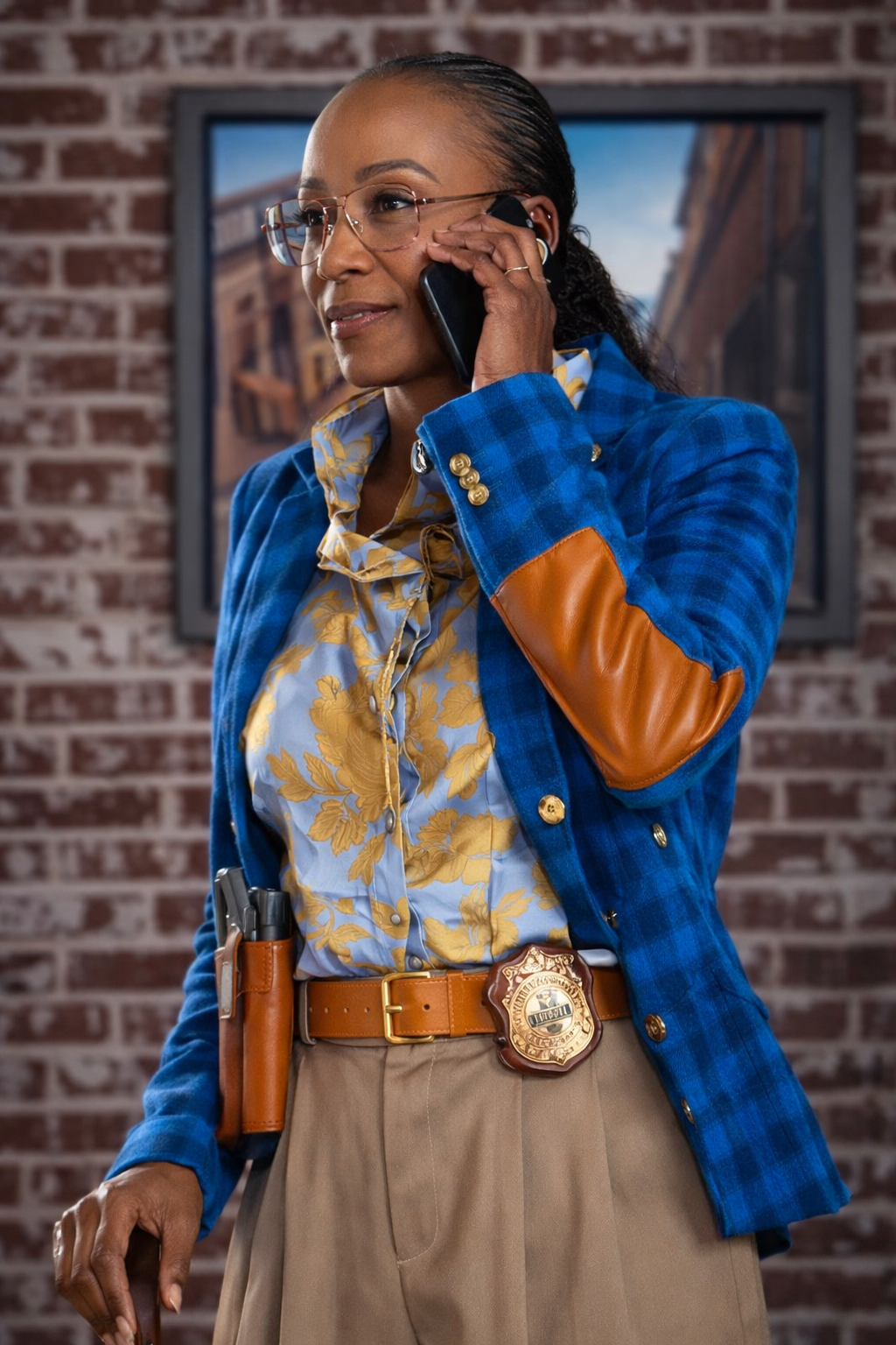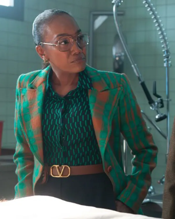 Amanda wears a green and burnt-orange plaid blazer confidently. The blazer features a structured fit and wide peak lapels. Textured wool-blend fabric gives the blazer a luxurious feel. The bold pattern creates a vintage-meets-modern fashion statement. She layers it over a patterned shirt for contrast. Amanda cinches the look with a tan leather belt. The outfit achieves a striking, high-fashion overall appearance.