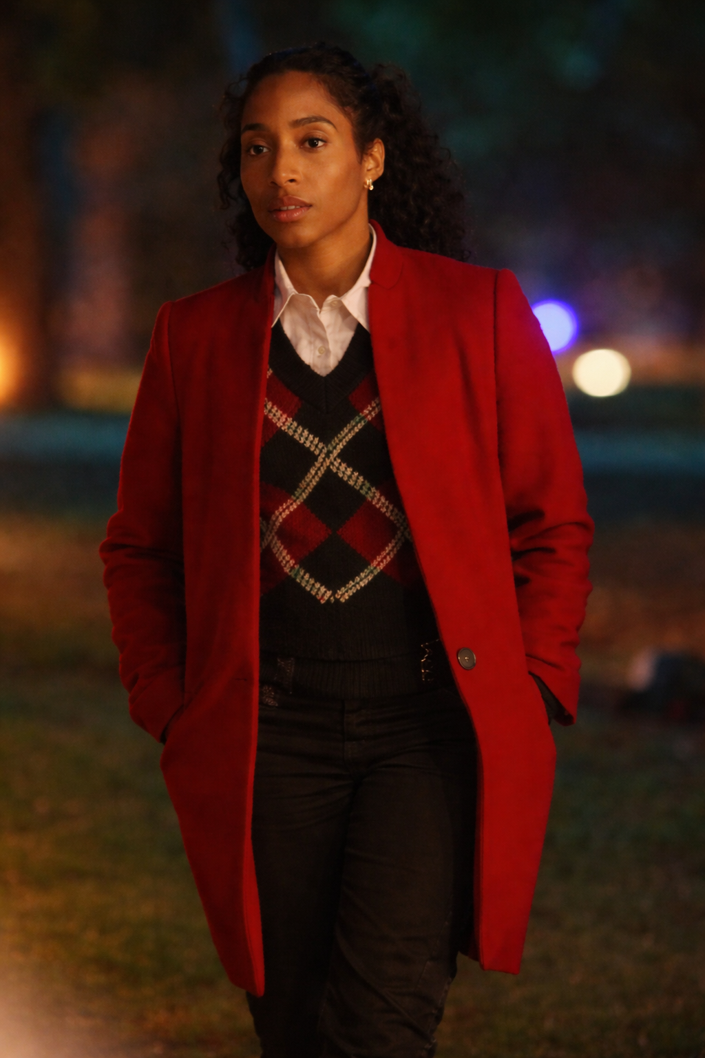 In Will Trent Season 4, Faith Mitchell shows strength and vulnerability. She navigates complex cases while facing romantic betrayal aftermath. Her red wool coat reflects authority, elegance, and bold style. The coat features a structured, slightly oversized silhouette mid-thigh. Set-in shoulders create a sharp, confident frame for her. Its stand-up collar buttons up or opens as narrow lapels. Designers crafted the coat from heavyweight wool-blend felt crimson. She styles it over a black, red, white argyle vest. She pairs the vest with a crisp, classic white shirt. Fans can buy this statement coat at Celeb Jackets.
