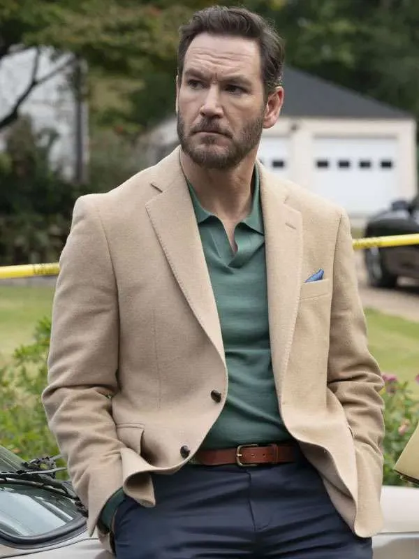 Paul Campano (Mark-Paul Gosselaar) returns in Season 4 matured. He guides Will through personal growth and daily meditation. His Wool Tailored Vent Blazer showcases preppy Ivy League style. The single-breasted blazer features a structured two-button closure. Structured shoulders enhance the blazer’s modern, layered-friendly fit. Notch lapels display detailed topstitching for handcrafted appeal. Designers craft the blazer from soft wool-cashmere or flannel. It offers a matte finish and naturally warm texture. The blazer includes a breast welt pocket with pocket square. Standard flap hip pockets complete the blazer’s functional design. He pairs it with a sage green polo shirt. Navy trousers finish the look professional, timeless, and stylish.