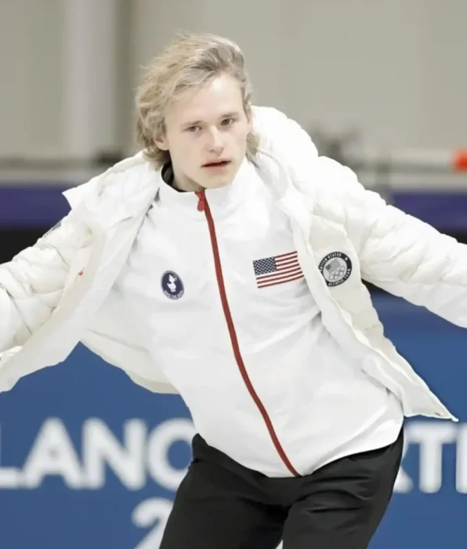 Ilia Malinin wore this white Nike ACG Team USA jacket during Olympic training appearances and ceremonies. The quilted insulated shell distributes warmth evenly while keeping a sleek athletic structure. A high funnel neck zip seals heat, and red pull tabs aid glove-friendly pocket access. Nike ACG branding and the Team USA crest sit on the chest, while the American flag marks the sleeve. The back typically carries bold USA lettering and a large insulated adjustable hood. Its ergonomic cut supports skating mobility while protecting against wind and snow.
