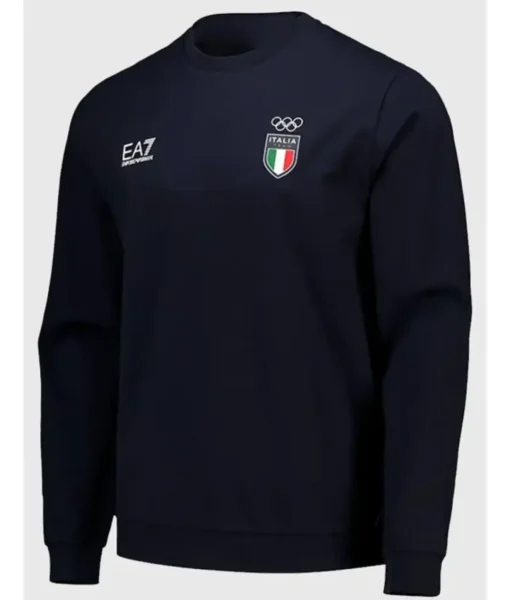 This black crewneck appears during off-duty training and Olympic village moments. Technical jersey fabric keeps athletes warm without bulk while maintaining stretch. The Italia crest and EA7 logo define the front, giving sleek national identity. Across the back shoulders, bold ITALIA lettering stands out in high visibility. Some versions include the national anthem printed internally, adding hidden patriotic detail.