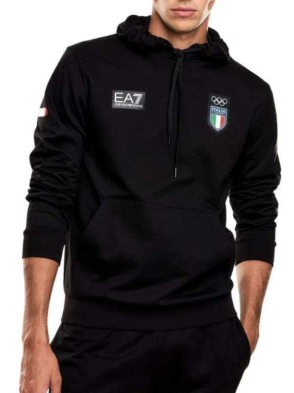 Italian athletes wear this black EA7 hoodie during training sessions and media appearances. Recycled fleece fabric offers breathable warmth within a clean athletic silhouette. The Italia Olympic crest and EA7 logo define the front chest with balanced branding. The back typically features subtle Italia lettering near the shoulders. Its hooded design, soft lining, and streamlined fit ensure comfort during travel in cold climates.