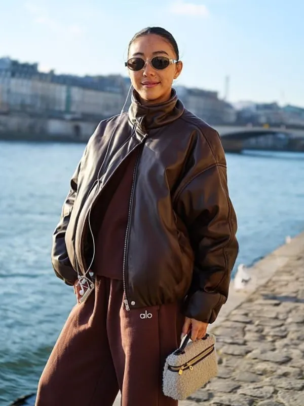 She styled the bomber jacket with straight-leg brown sport jogger pants by Alo. The pairing reinforced the outfit’s strong monochromatic direction. The deep chocolate jacket matched the athletic brown joggers seamlessly. This tonal combination created a smooth and continuous visual flow. She carried a small structured beige and brown shearling fluffy bag by Loro Piana. The bag featured a refined top handle design. Its plush texture softened the sleek leather contrast. The contrast made the outfit dynamic without overcomplicating the styling. She held a mobile phone in her hand confidently. She embodied contemporary street style—practical, connected, and constantly in motion.