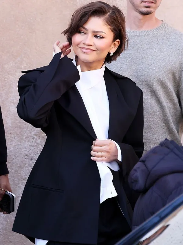 Zendaya wore the Rome 2026 Black Blazer on March 27, 2026, drawing immediate attention. The deep black tone gives the blazer a strong and commanding presence. Moreover, the oversized sculptural silhouette creates a dramatic shape that feels modern yet timeless. The designers crafted the blazer from mid-weight fabric, ensuring structure with a smooth, fluid drape. Additionally, the wide structured shoulders enhance its powerful aesthetic, making it perfect for statement dressing. The elongated sleeves slightly flare at the cuffs, adding a graceful yet bold finish. As a result, the overall design balances strength with elegance effortlessly.
